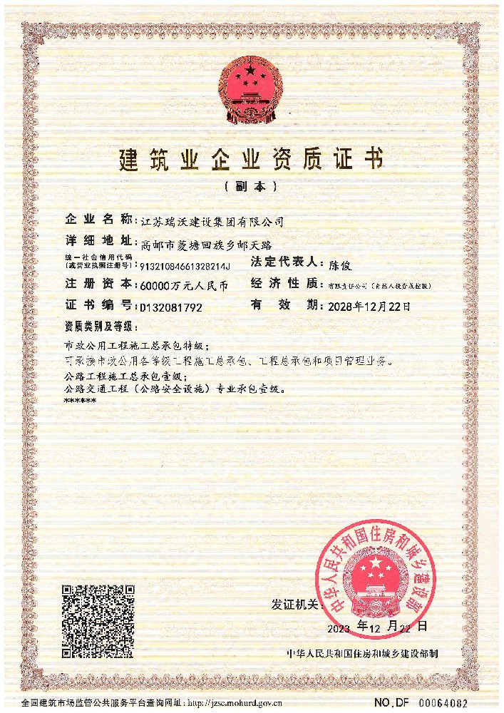 江蘇瑞沃建設(shè)集團(tuán)有限公司成立于2007年,是一家以市政、交通工程建設(shè)為主導(dǎo),集房屋建筑、交通安全設(shè)施、城市道路照明工程、電力工程、隧道工程、航道工程及投融資為一體的綜合性企業(yè)。企業(yè)注冊(cè)資本60000萬元,現(xiàn)有各類技術(shù)人員580人,其中中、高級(jí)以上人員498人,注冊(cè)類人員268人,一、二級(jí)建造師166人。公司榮獲“江蘇省建筑業(yè)優(yōu)秀企業(yè)”、“江蘇省五一勞動(dòng)獎(jiǎng)狀”,連續(xù)多年被評(píng)為“揚(yáng)州市先進(jìn)企業(yè)”、“江蘇省建筑業(yè)百強(qiáng)企業(yè)”,連續(xù)八年蟬聯(lián)百強(qiáng)企業(yè)基礎(chǔ)設(shè)施類第一名。